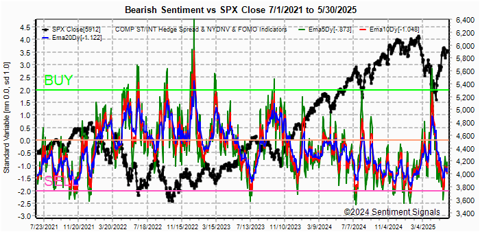 Update Alt EMA. Bearish sentiment moved closer to a weak Sell. The ST Composite as a ST (1-4 week) indicator includes the NYSE volume ratio indicator (NYDNV/NYUPV & NYDNV/NYDEC) and the UVXY $ Vol/[SPX Trend, SMA only]. Weights are 80%/20%.Update. Bearish sentiment fell just below a weak Buy.